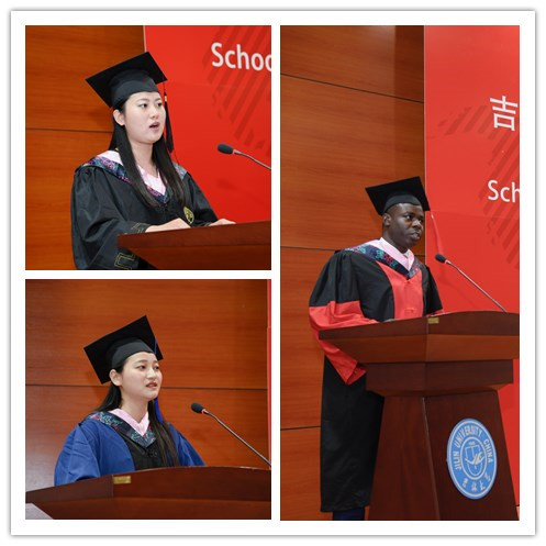 接下来,本科毕业生代表张恒同学、硕士研究生代表戴淑婷同学和留学生毕业生代表小布同学分别发言,代表自己的同学抒发毕业感言。张恒同学说到珍贵的大学时光为同学们与众不同的精彩人生注入了无限的力量,感谢学院赋予了学生逐梦的翅膀,感谢母校为学生们提供了追梦的平台。她勉励同学们在今后的学习和生活中不忘初心,不断突破自我,在治学、处事、为人各方面超越昨天的自己,开启全新的旅程。戴淑婷同学在发言中感慨学院日新月异的蓬勃发展,她表示学院不仅教会学生知识,还为同学们提供了一个多民族、多文化的国际化交流与对话平台,让学生们了解不同民族、宗教与文化,能够以更广博的眼光、更谦逊的态度去看待这个世界。学院教会学生们要常怀对知识、对世界的敬畏之心,这些来自学院各位老师的栽培将是学生们一生中最宝贵的财富。来自加纳的博士研究生小布(BRIGHT LUMOR MENSAH)同学代表毕业留学生感谢学院和看片狂人