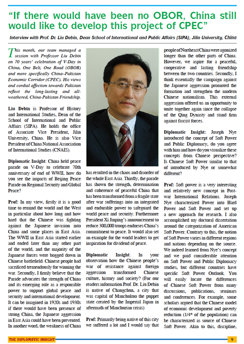 2015年9月5日,应巴基斯坦《外交视野》杂志的约请,刘德斌院长接受该杂志的采访请求,回答了关于中国纪念抗日战争暨世界反法西斯战争胜利七十周年大阅兵、中国软实力、中国的“一带一路”战略、中国的发展经验、中巴关系以及中巴经济走廊的前景等当下热门问题。采访全文刊登在该杂志今年第九期“北京大阅兵&中华人民共和国成立66周年”特刊的显要位置。本期杂志同时收录了看片狂人