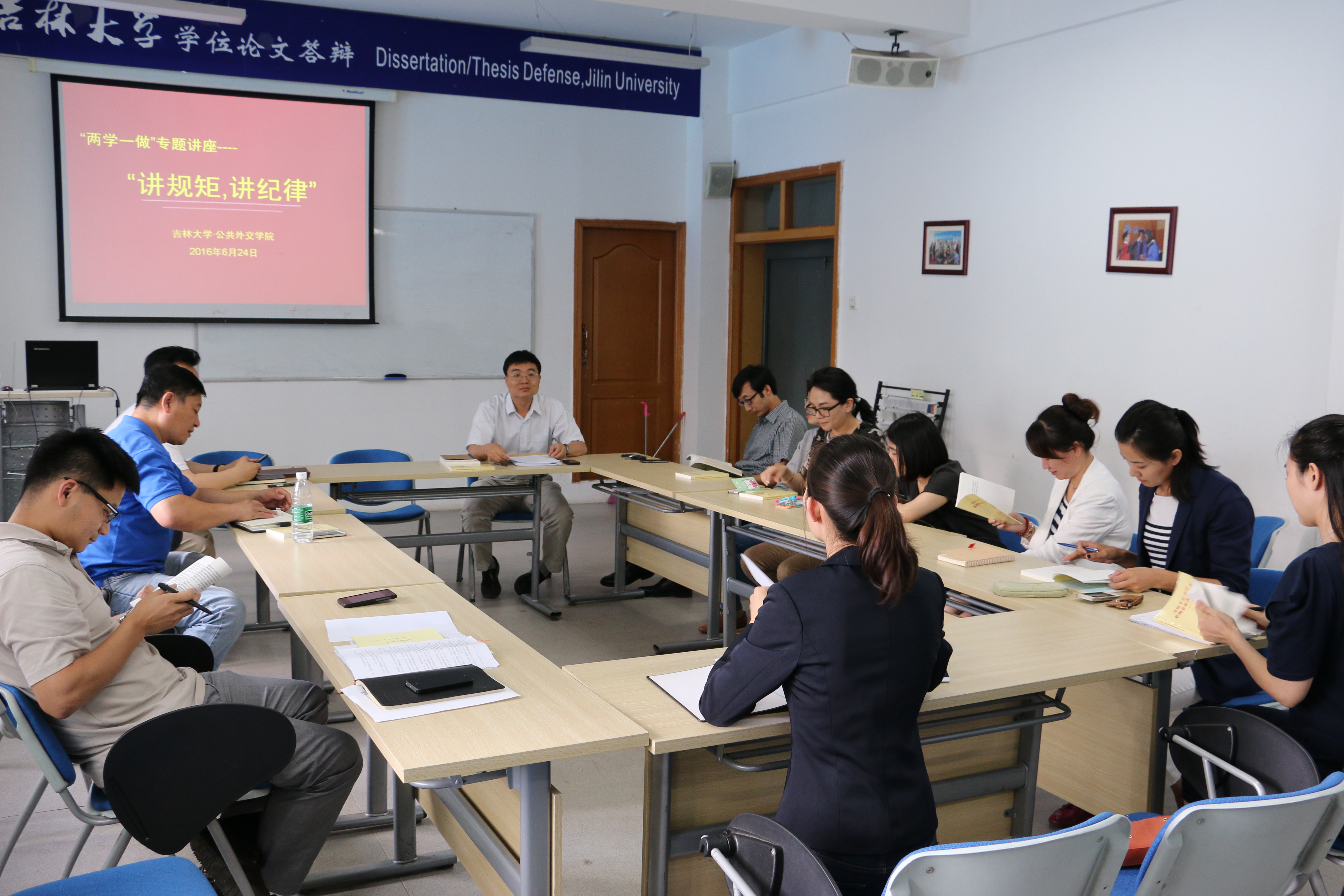 王秋彬同志结合自己学习习总书记系列讲话的心得,从党的规矩和纪律的主要内容,党员为什么要讲规矩、有纪律,如何做到讲规矩、有纪律等三个方面做了专题报告。首先,党的规矩和纪律包括党章、党的纪律、党章、国家法律、党在长期实践中形成的优良传统和工作惯例。其次,他从历史经验、他者经验和现实挑战三方面解读了党在新时期讲规矩、有纪律的必要性。认为,这是党取得革命胜利的根本保障,也是党战胜复杂形势的现实需要,是每个党员必须高度重视和严格遵守的。最后,王秋彬结合学院具体工作谈了怎样做到“讲规矩、有纪律”。他强调,要从思想到行动做到知行合一,做讲规矩、有纪律的合格共产党员,具体而言包括四个方面:自觉维护党的权威,在任何情况下与中央保持高度一致;要有大局观念和全局意识;要讲诚信、敢担当;要自觉服从组织决定,个人利益服从集体利益等。