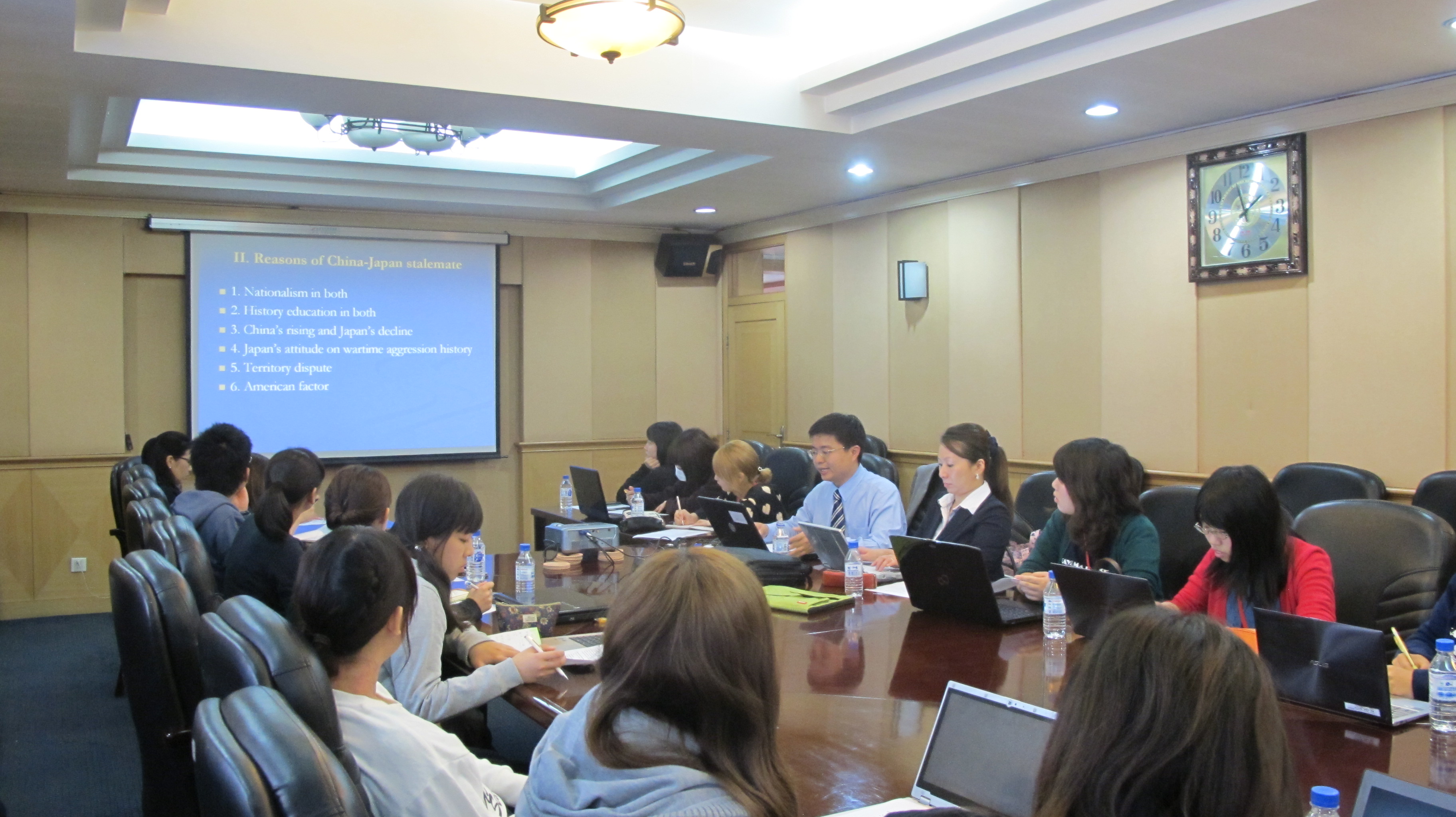 学生代表随后分别对各自学校的基本概况及当地风土人情进行了细致而活泼的描述,并分小组就上述内容进行了热烈讨论;23日下午,王秋彬副院长为冈山大学学生做了主旨为“中日关系再思考”的专题讲座,在学生中间引起反响与共鸣,现场师生就相关议题进行了坦诚的问答与交流;24日上午,学院教师王黎教授分别从历史与现实的角度对中日两国的互动与交流进行阐释,并解答了同学们围绕该领域所提出的问题。活动结束前夕,冈山大学的同学们用PPT的形式回顾总结了几天来在长春的体验与收获,对看片狂人