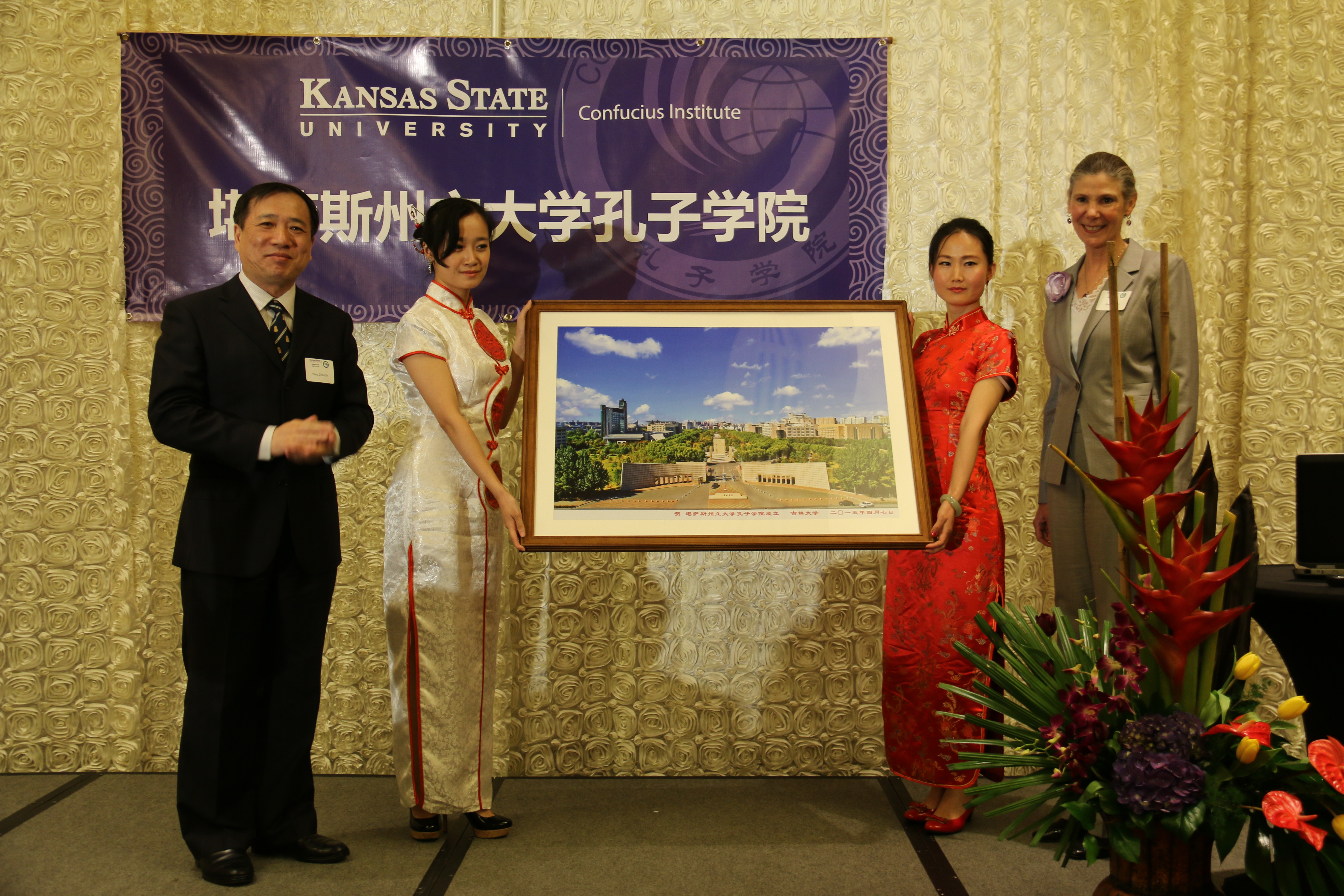 杨振斌代表学校向堪萨斯州立大学赠送了学校中心校区鸟瞰图。杨振斌、柯克·舒尔茨、艾谱莉·梅森和刘军共同为孔子学院剪彩和揭牌。当天晚间,堪萨斯城华人乐团与堪萨斯州立大学师生组织进行了主题为“中国的声音与色彩”专场文艺演出。