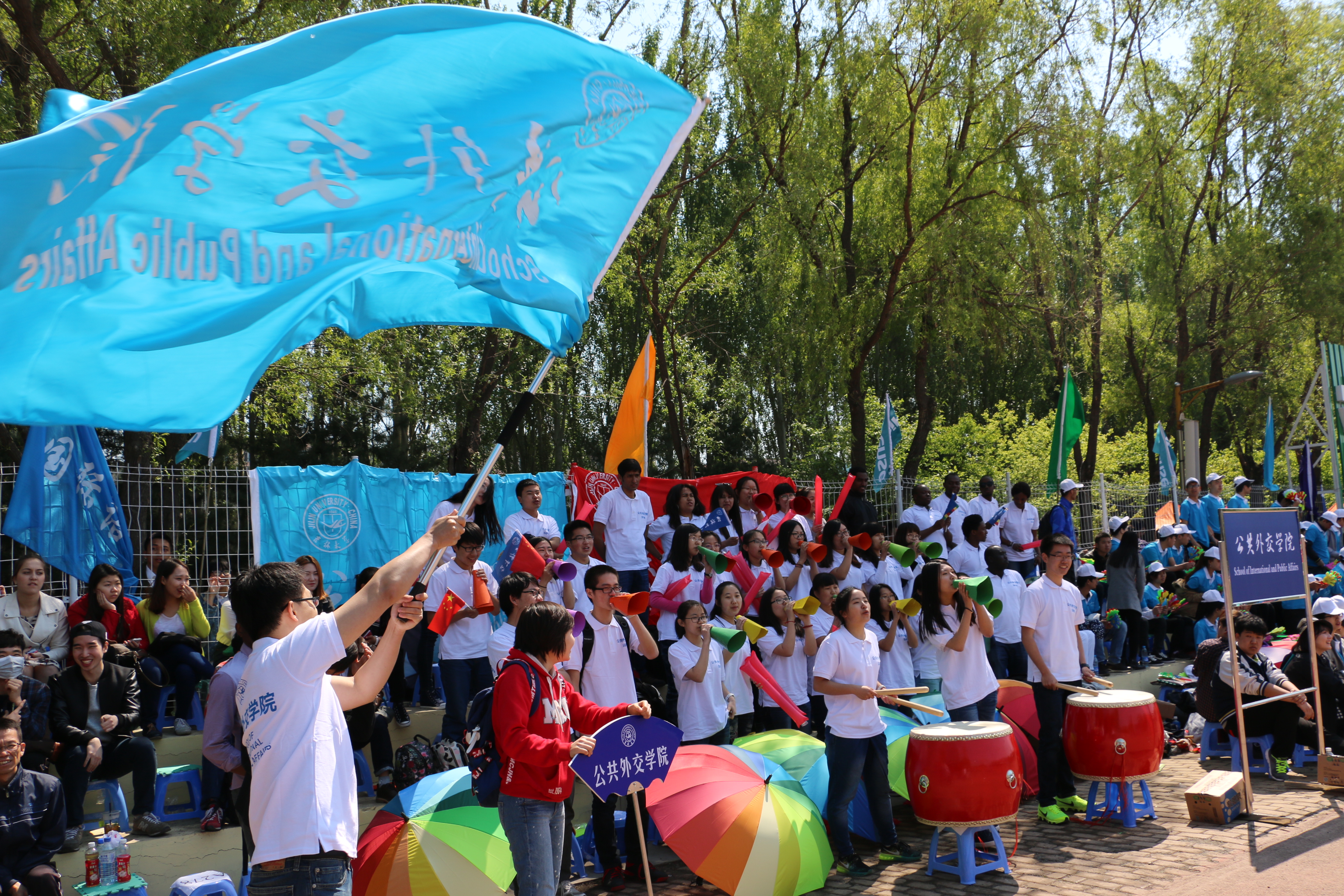 观众席时,被学生们响亮的歌声和口号声吸引了。李元元校长来到同学们中间,亲切地和大家说:“你们是首届公共外交专业的学生,我刚才在主席台上看到你们了,非常棒,希望你们取得好成绩”!随后,李校长还与学生们一起击起了大鼓,在同学们的一致邀请下,杨振斌书记、李元元校长等校领导与师生们合影留念。