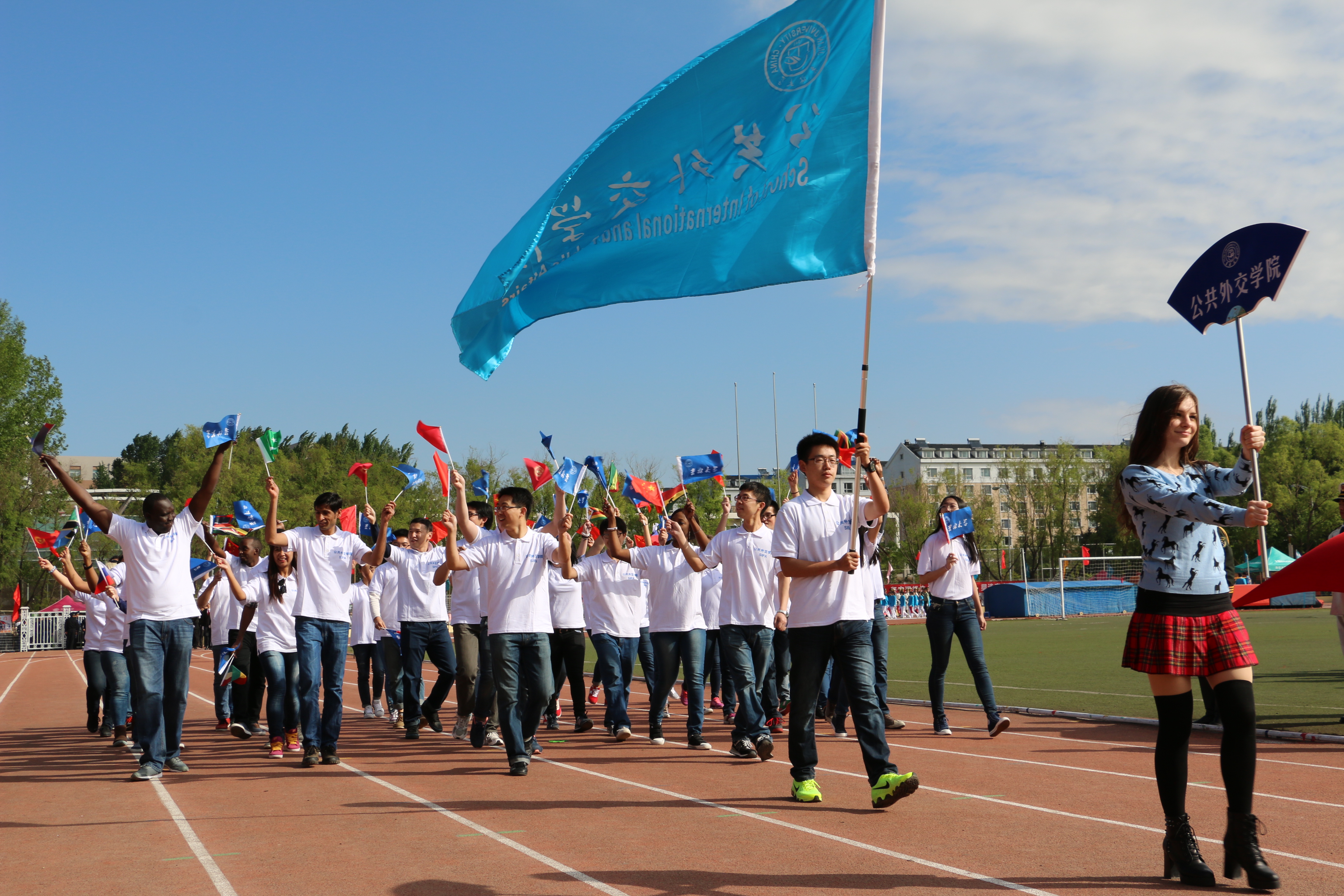 同学们起得比平时上课还要早,这全都是为了入场方队做准备。换上白底蓝字看起来高大上又小清新的院服,踏起飞扬的步伐,手拿各自国家的国旗和校旗,同学们激情洋溢地昂首走过主席台前。走在队首高举院牌的是来自乌克兰的留学生玛丽亚,她青春靓丽的身影引来观众席上的阵阵欢呼;旗手是体育委员梁鲁广,他飒爽的英姿显得分外帅气;方队的主体是由学院的首届中国本科生和留学生组成的,他们各自手挥国旗,迈着整齐地步伐,喊着激昂的口号,把看片狂人