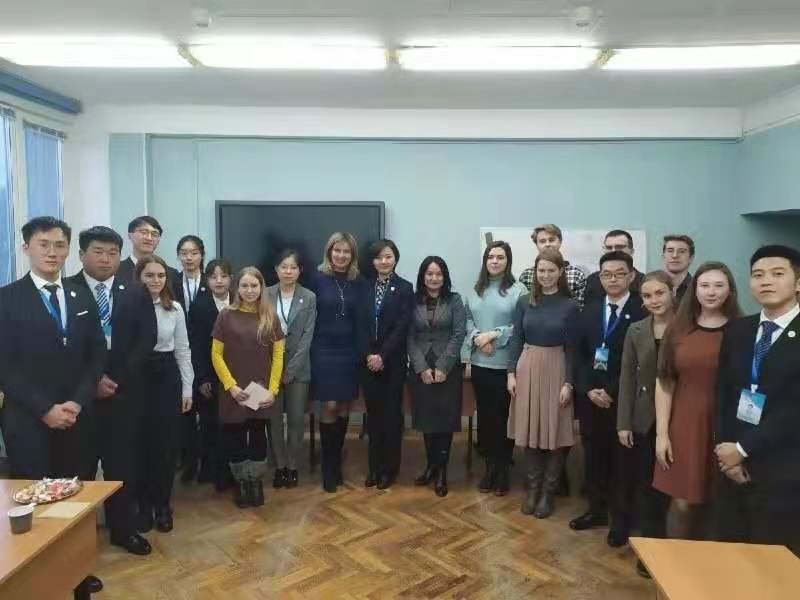 学生进行探讨,刘治辰、胡帅等同学从不同的角度对此进行了解答。张词含、李峥榕等同学也提问向对方了解世界政治系在招收国际学生、推动青年交流方面的具体措施,卡佳老师及娜塔莉娅主任回答了学生们关心的问题,世界政治系的学生们谈了自己的感受。双方师生就中俄两国能源合作、媒体网络对于塑造中俄两国形象、汉语教育在俄罗斯大学发展情况、莫大国际组织人才培养经验等多方面展开了深入交流。