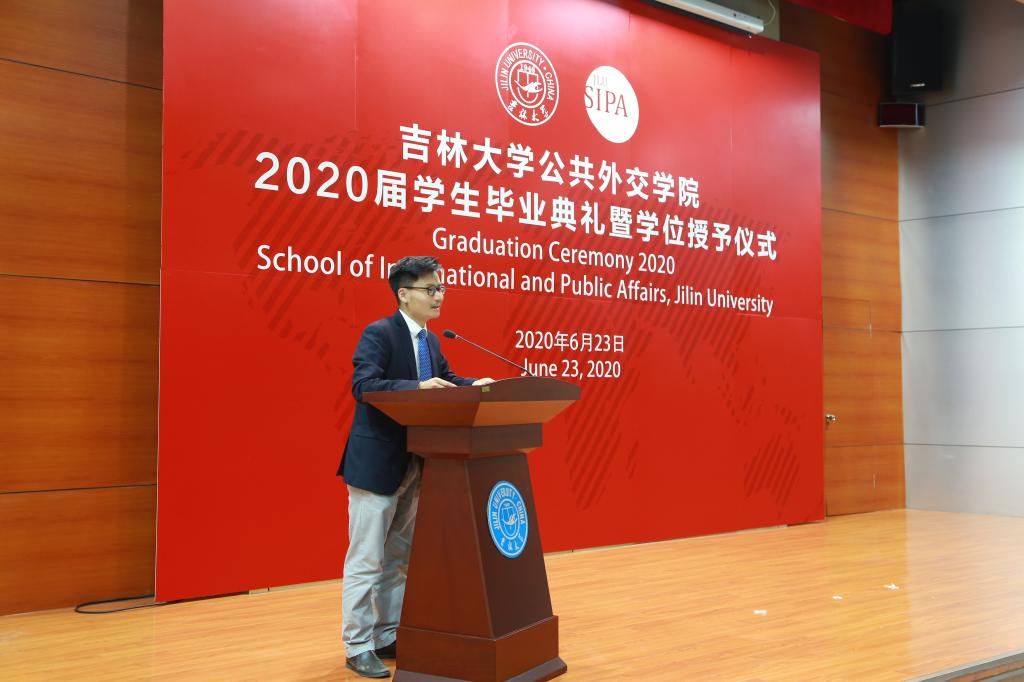毕业典礼在雄壮的国歌声中拉开帷幕,院长肖晞教授以《风雨同舟 阳光依旧》为题致辞,为全体毕业生送上诚挚的祝福和殷切的希望。她首先强调在全国抗击新冠疫情的特殊时期,组织同学们返回校园开展毕业活动体现了学校对毕业生的全方位关怀和厚重的情意。作为外交学专业的学生,应该更加深刻地认识到国家在抗击疫情的过程中最大程度保障人民生命安全的决心,看到中国特色社会主义制度的优越性、中华民族的伟大精神以及在国际社会中得到的广泛赞誉和认可,将“世界眼光,家国情怀”的院训内化于心、外化于行,并提议向全国奋战在抗疫第一线的医护人员、各行各业的从业人员和志愿者以及严格遵守居家隔离的每一位平凡而伟大的参与者鼓掌致敬。