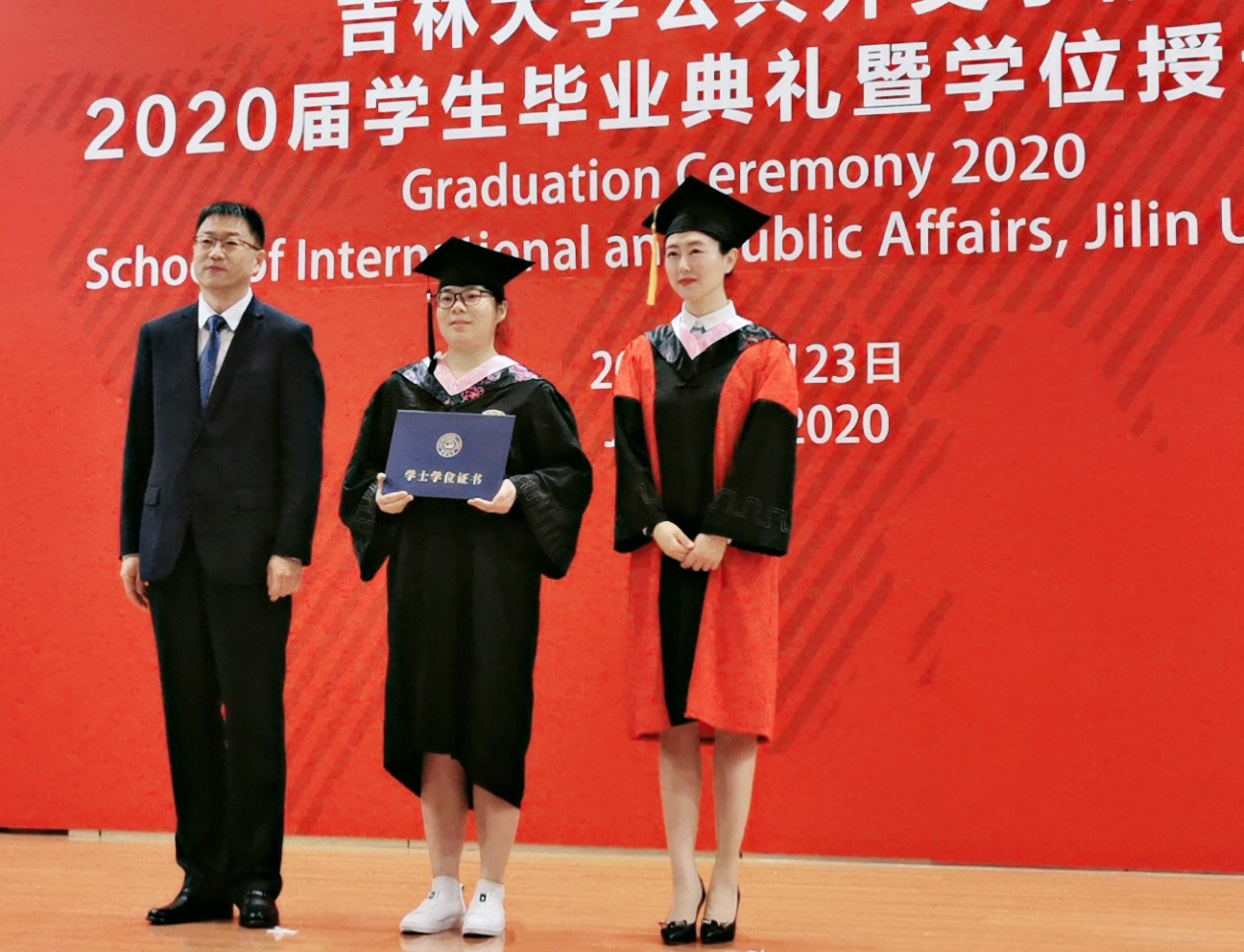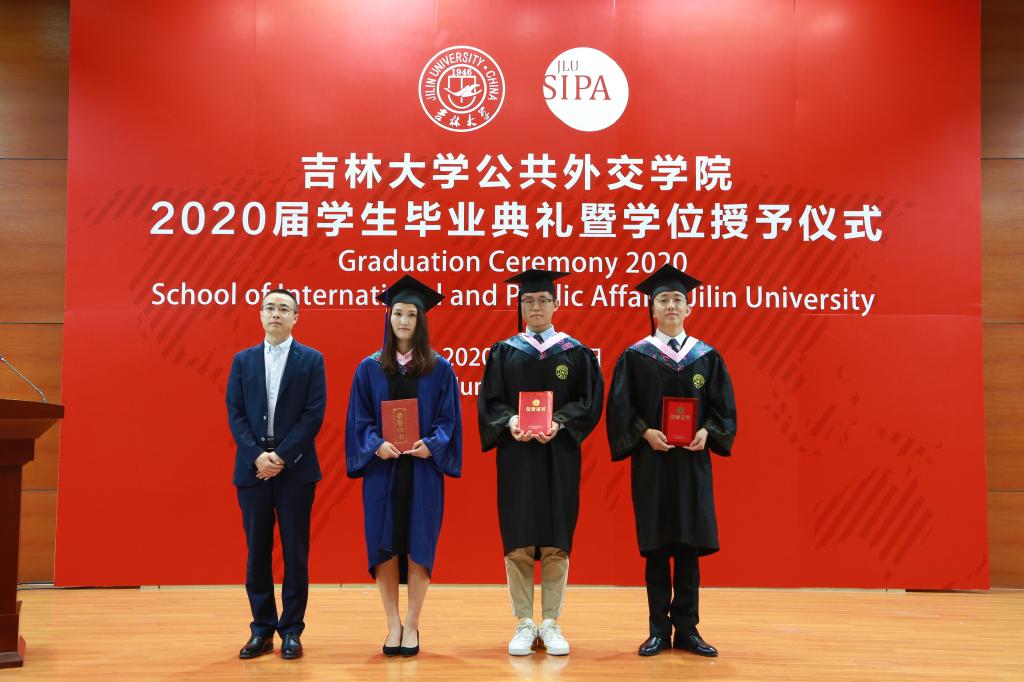 接下来,孙兴杰副院长分别宣读了外交学专业2020届本科生、硕士研究生毕业生名单,今年共有38名本科生和10名硕士研究生顺利毕业。随后,伴随着激昂的音乐,到场的毕业生一一上台,肖晞院长为他们拨动流苏,杨民书记为他们颁发学位证书,他们和每名同学合影留念。在自己的大学生活即将画上圆满句号的时刻,同学们神情庄重又难掩激动。