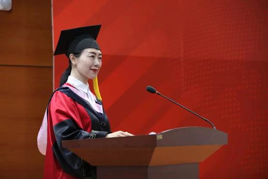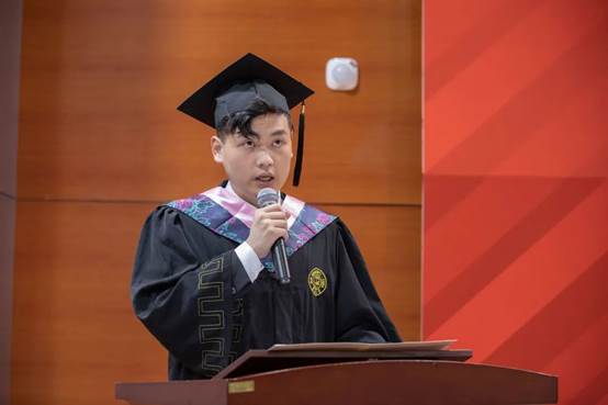 在毕业生代表发言环节,本科生代表苏伊文同学回忆大学四年成长经历,向台前幕后甘为人梯的师长、团结友爱互帮互助的同学们致以诚挚的感激和敬意,立志以“不忘初心,牢记使命”的坚定去传递星火,鼓励同学们以“世界眼光,家国情怀”的胸襟担负使命。