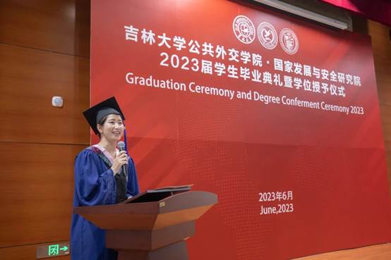 来自埃及开罗的留学生代表Samaa Alieldien同学在发言中感谢中国三次为她敞开大门,提供求学机会。从课堂学习到课余生活,从学习中国文化到专注学术研究,Samaa Alieldien同学对各位领导老师的指导与帮助、同学的鼓励与陪伴表达诚挚感谢。她表示,在吉大的生活丰富了其成长经历,提高了其专业能力,使她更加深入地了解中国文化,未来她将秉持“求实创新 励志图强”的校训坚定前行。