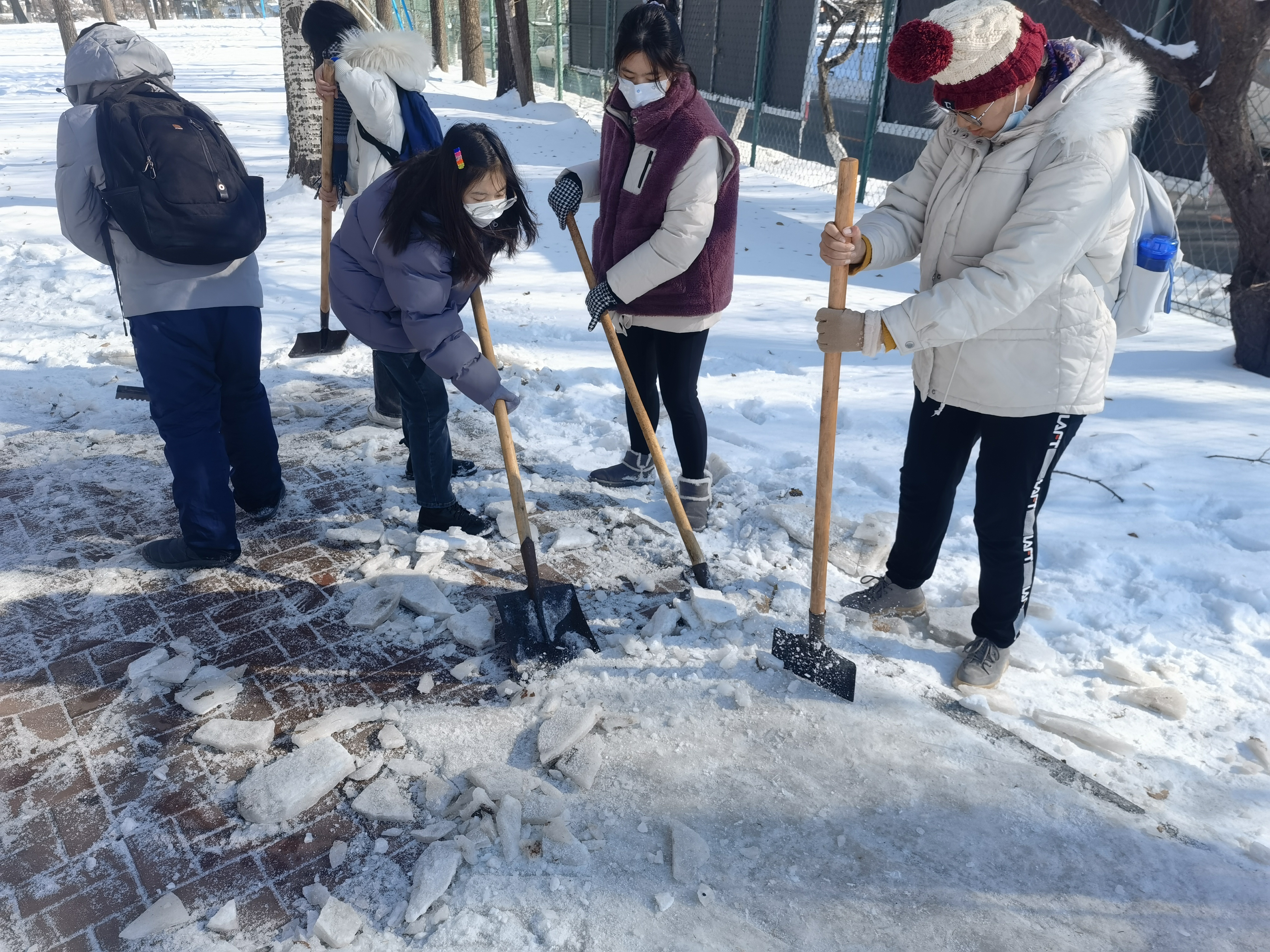 在学院的组织安排下,三十多名入党积极分子带上铲雪的工具,一齐来到了篮球场旁的小路上,很快地投入了热火朝天的劳动中。路面结冰较厚,较难铲动,女生们力气较小,便负责松动冰面以及将冰块运到路边,而男生们力气较大,便负责将冰铲起。大家分工明确、紧密配合,氛围其乐融融,工作紧锣密鼓地进行地同时又充满了欢声笑语。天气很冷,但是同学们除雪的热情不减,充分地展现了学子的昂扬向上的精神面貌和不辞辛苦服务他人的品格。经过一个多小时的辛苦铲雪工作后,将负责的区域的积雪进行清扫,为行人开辟出了一条安全的道路,扫雪任务基本完成,消除了因大雪天气导致的安全隐患,为师生的安全出行提供了方便