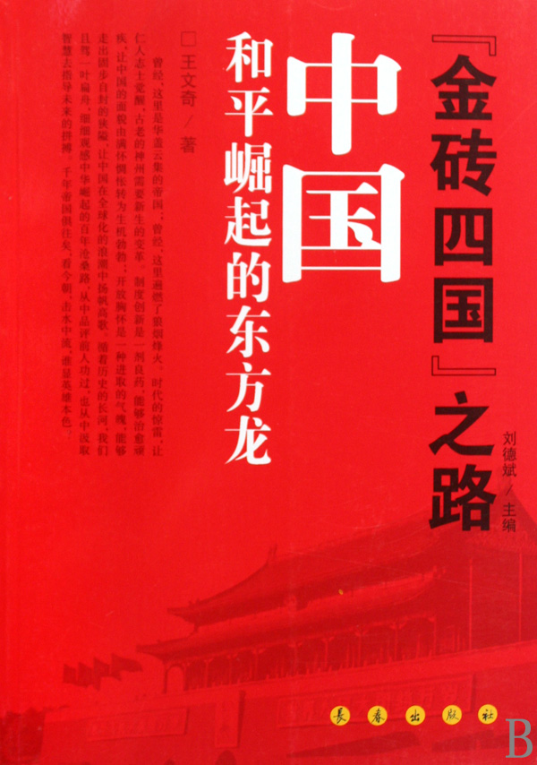 《中国:和平崛起的中国龙》:中国曾经是世界经济的中心。如今却在走着艰难的崛起之路、复兴之路,这其中的原因我们不能不加以考察。因为正是这段考察才能让我们找到一条可持续发展之路。近代中国落后给了西方国家,在列强的坚船利炮前瑟瑟发抖,是因为中国闭关锁国的政策使中国失去了融入世界的机会,同时也因为闭关锁国使中国的体制创新之路难以形成。当新中国成立后,因为没有其他的经验可循,中国采取了苏联模式来发展社会主义,期间因为模式的偏差使中国徘徊了三十年。改革开放之后,中国人终于认清了发展道路,一方面开始了迅速的体制创新,一方面开始了全方位融入世界的进程。如果中国能妥善处理发展中的问题,那么中国就会突破“金砖四国”,成为一个名副其实的大国,而不只是经济强国。