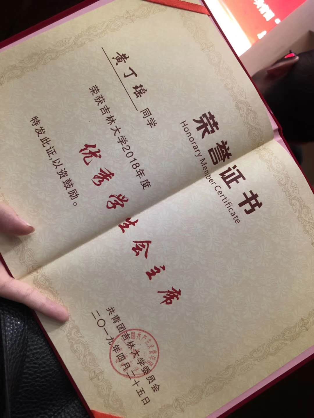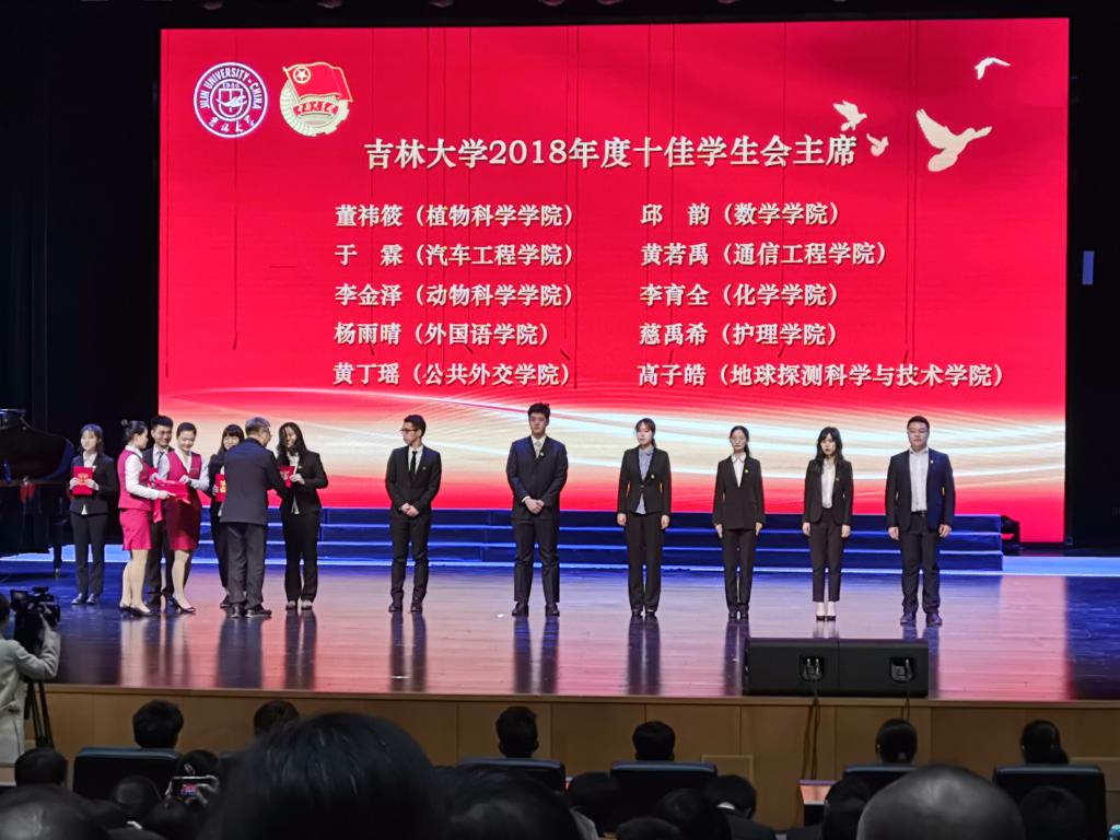 共青团“纪念五四运动100周年”总结大会暨“我和我的祖国”主题合唱展演活动中黄丁瑶同学被授予2018年度十佳学生会主席荣誉称号。