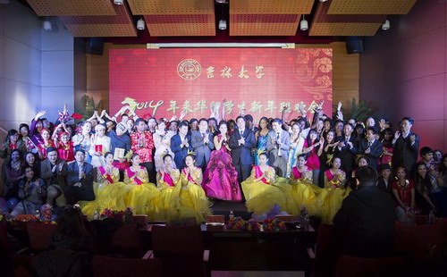 2014年来华留学生新年联欢会在国际学术大讲堂隆重举办。校长李元元亲临现场,并代表党委书记陈德文和全校师生向全体留学生致以节日问候,与留学生一起共迎新年。学校校长办公室、党委宣传部、学生工作部、研究生院、教务处、团委和国际合作与交流处及国际教育学院/看片狂人