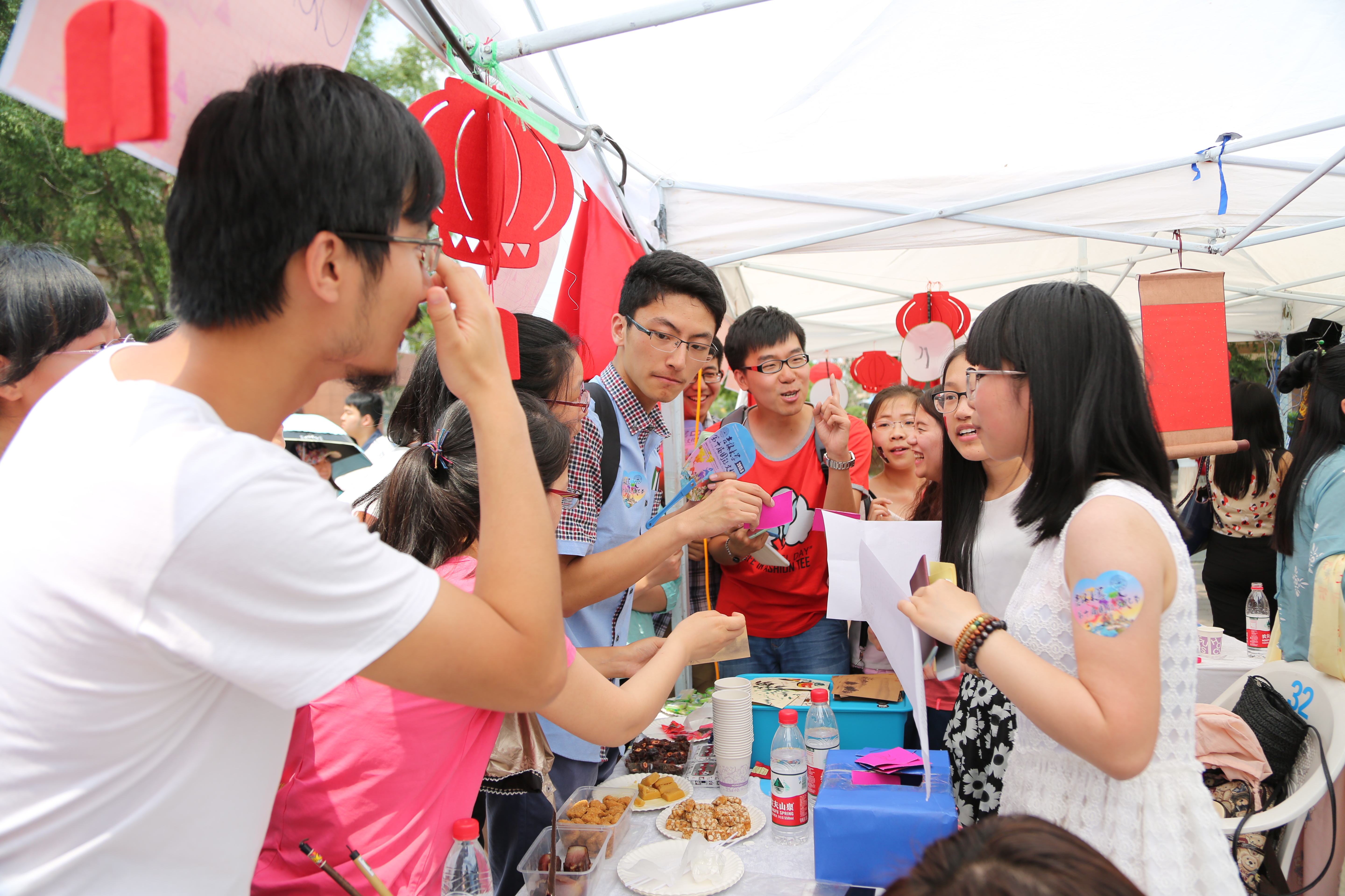举行的文化日活动。新成立的“Together”社团全程负责了这次文化日中国馆的布置、管理工作。“Together”社团的同学为中国馆设计了三个体验环节,分别是回答和中国文化相关的题目、亲自制作陶艺花瓶、穿上汉服、唐服并拍照留念。前来参观中国馆的朋友可以分别体验这三个环节,充分参与到中国文化的体验活动中,许多参与体验的留学生说着有些生涩的汉语回答中国文化问题,场面十分有趣。并且很多人是第一次亲身体验陶艺制作,虽然双手沾满了陶艺泥巴,不过看到自己亲自制作出来的陶艺罐子,相信他们的心里充满了成就感。