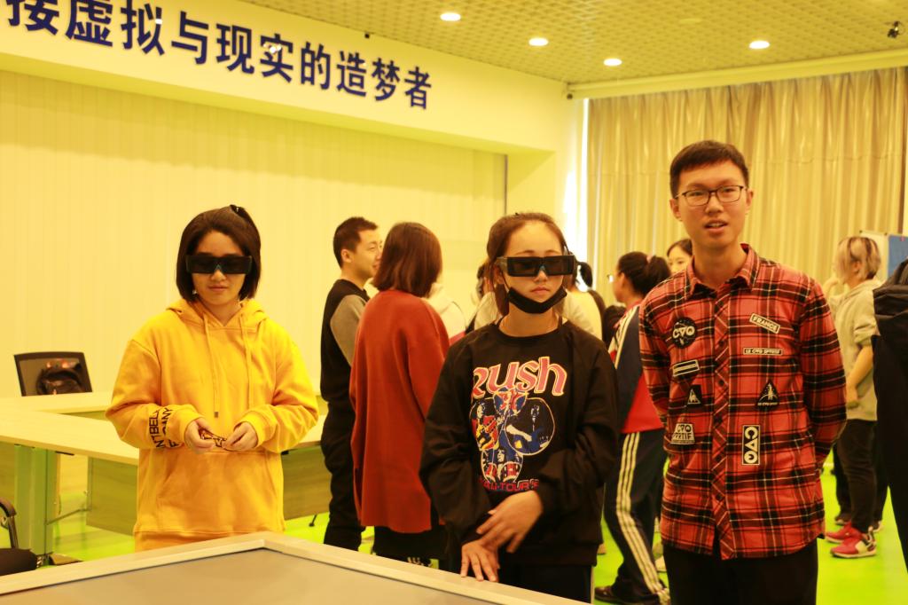 志愿者带着各自伙伴参观了吉大校园,在鼎新楼前合影留念。校园参观结束后,一行人来到位于李四光楼的“虚拟现实梦工厂”,计算机学院的王老师为同学们介绍了VR技术的原理以及现场设备的操作方式。在计算机学院教师和学生的指导下,同学们迫不及待地戴上VR眼镜,亲身体验了科技感满满的VR虚拟现实技术,现场气氛热烈,所有同学都踊跃参与。