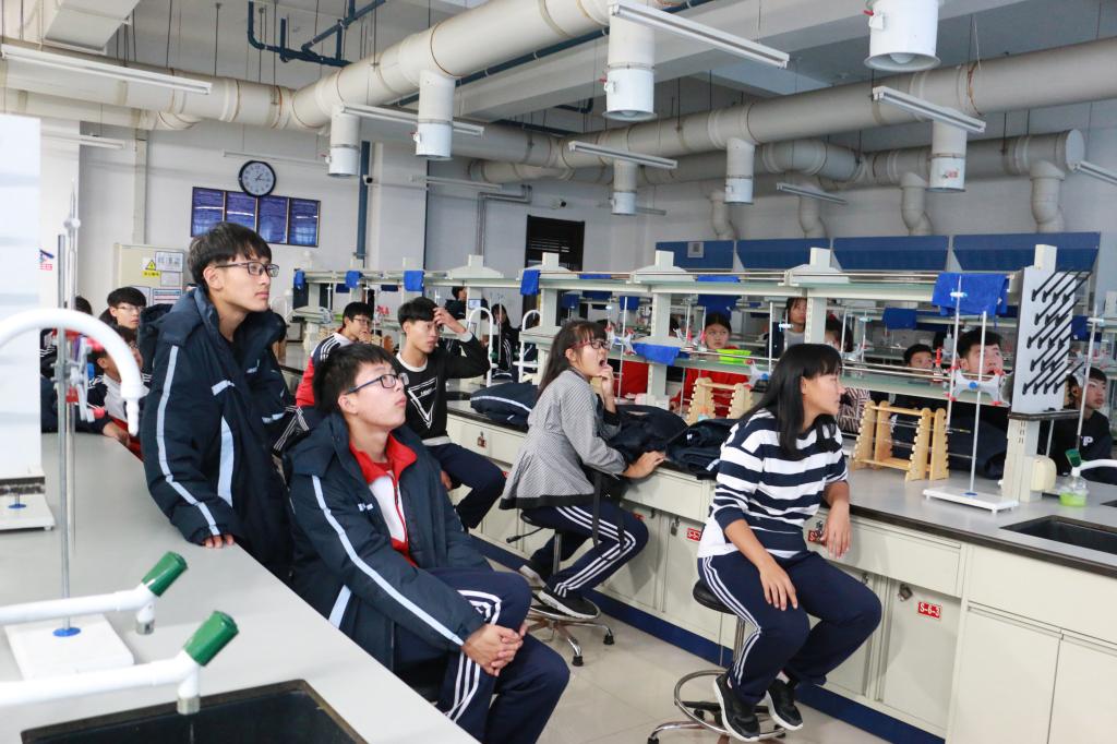 下午,来访师生来到位于李四光楼的化学实验室,化学学院马强老师通过两段视频展示了化学实验的魅力所在,并向同学们介绍了化学实验室的注意事项和实验器具的操作方法。同学们认真观看和聆听,开始对化学实验产生初步兴趣。
