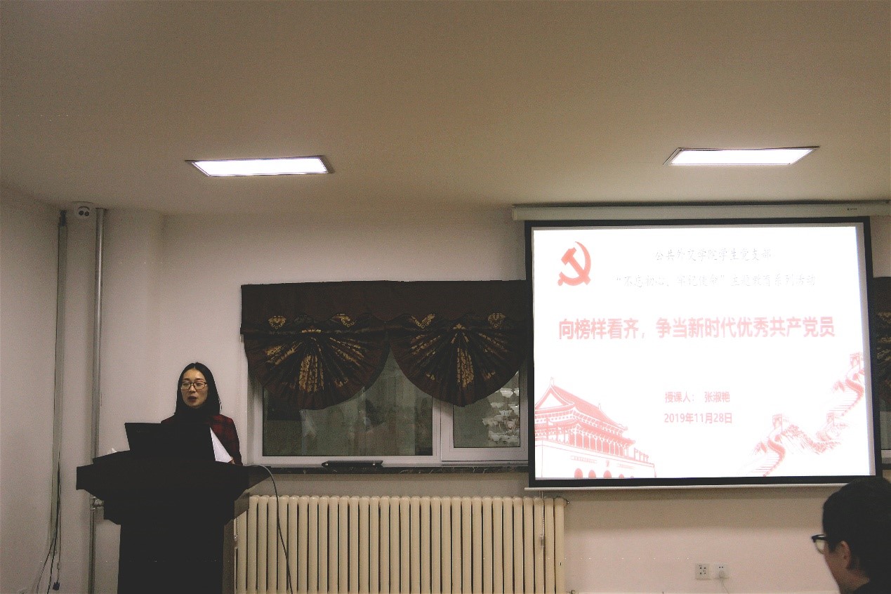 张淑艳老师从“什么是中国共产党人的初心与使命,为什么要‘不忘初心,牢记使命’,以及作为一名学生党员如何向榜样看齐以践行不忘初心、牢记使命”三个方面,为与会同志上了生动形象的一课。