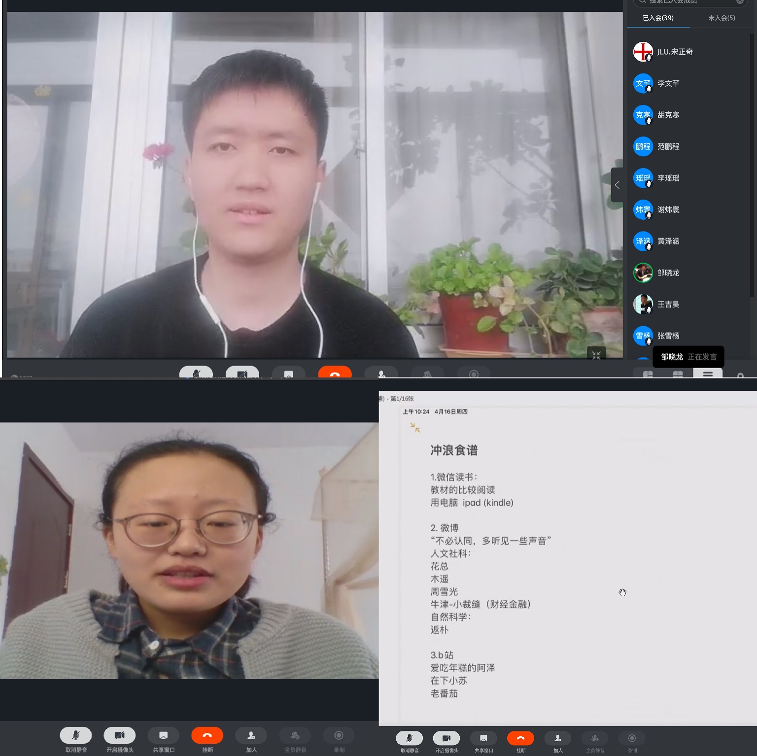 班会开始,首先由赵宇玺、李文芊、张词含、信思涵、范鹏程、宋美超六位同学为大家分享他们在学习生活中的一些心得体会。范鹏程和宋美超同学首先都提出自己对疫情的关注。范鹏程同学讲述了自己老家针对疫情的时间线并进行了阅读方面的好书推荐,建议大家抓紧在家的机会进行阅读。宋美超同学提出我们应该敬畏生命,感谢战斗在一线的医护人员。并建议大家关注疫情背后的经济以及国际形势的变化。李文芊同学为大家提供了需要获取的信息的来源如微信读书、微博等。