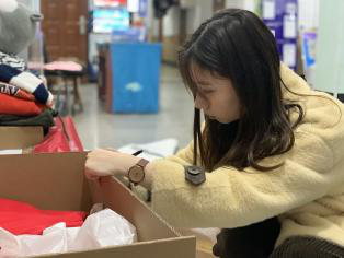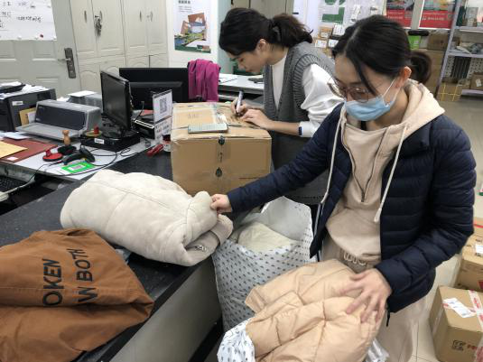 师生党员利用2天的时间按照质量、款式等进行分类和整理装袋(箱),并在每个快递箱和快递袋里放入了暖心的祝福小卡片。