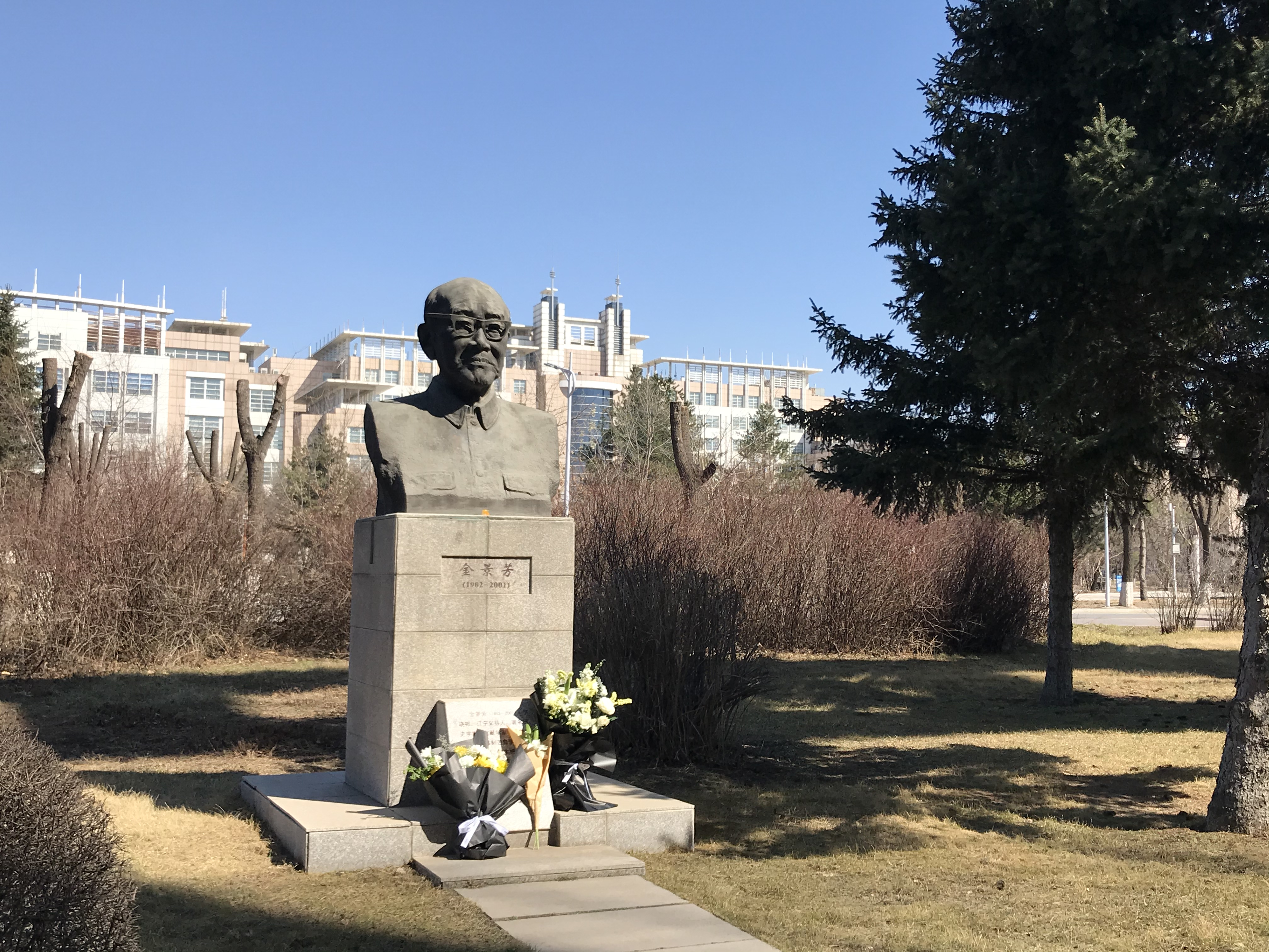 紧接着,同学们去瞻仰金景芳先生,先生是著名的历史学家、文献学家、易学大师。同学们站在雕像面前,安静地听完先生的人生履历,向先生的雕像、还有那雕像之后伟岸的灵魂鞠躬致礼,学生代表上前扫灰、献花,最后向先生的雕像告别。