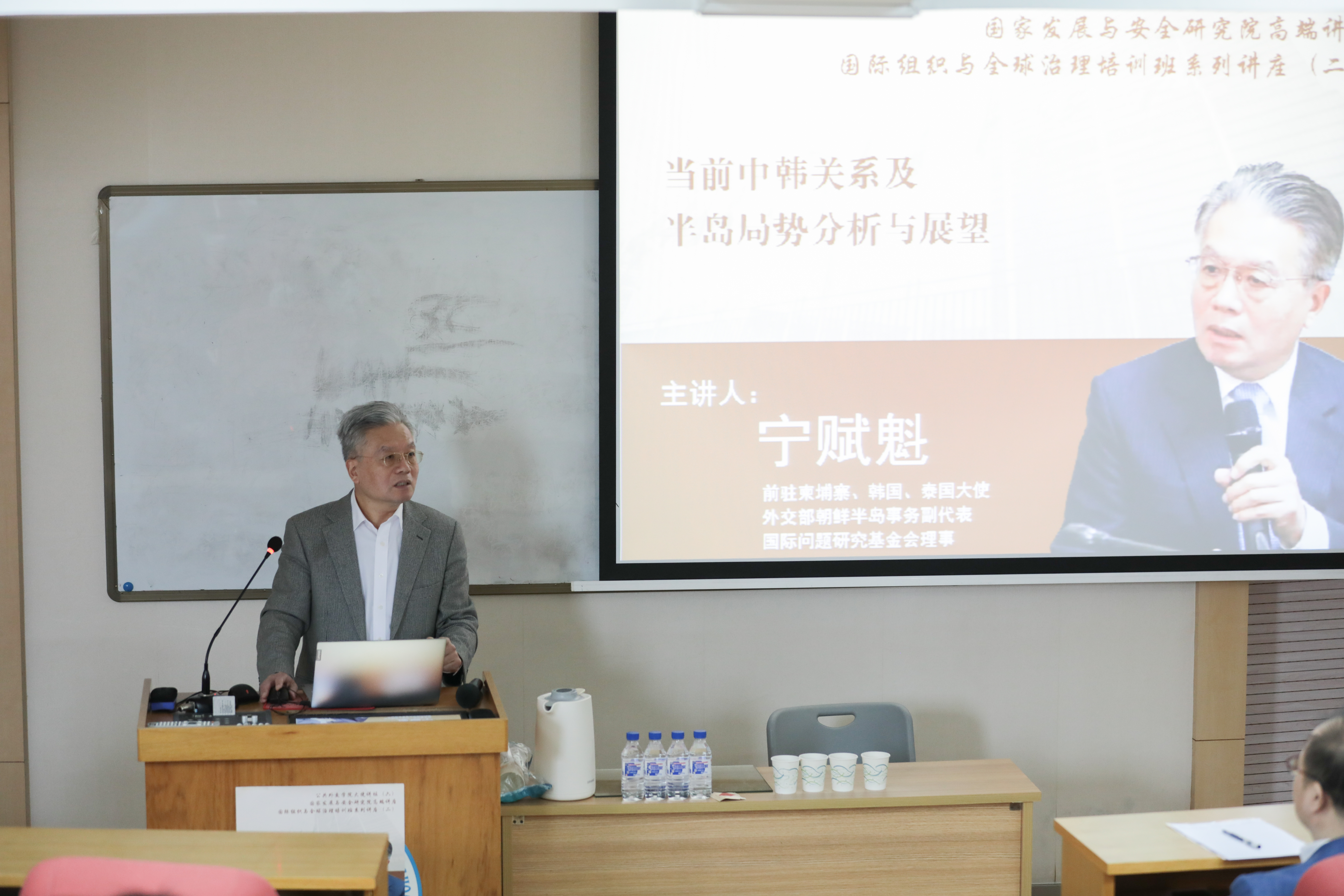 4月25日上午,前驻柬埔寨、韩国、泰国大使,外交部朝鲜半岛事务副代表,国际问题研究基金会理事宁赋魁大使作题为《当前中韩关系及半岛局势分析与展望》专题讲座。讲座由国家发展与安全研究院副院长郭锐教授主持,看片狂人