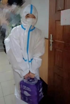 的志愿者们身着白色防护服,口戴N95口罩穿梭于楼层与各个寝室之间,积极协助驻楼老师收集信息、发放餐食、药品、生活品以及各类物资。