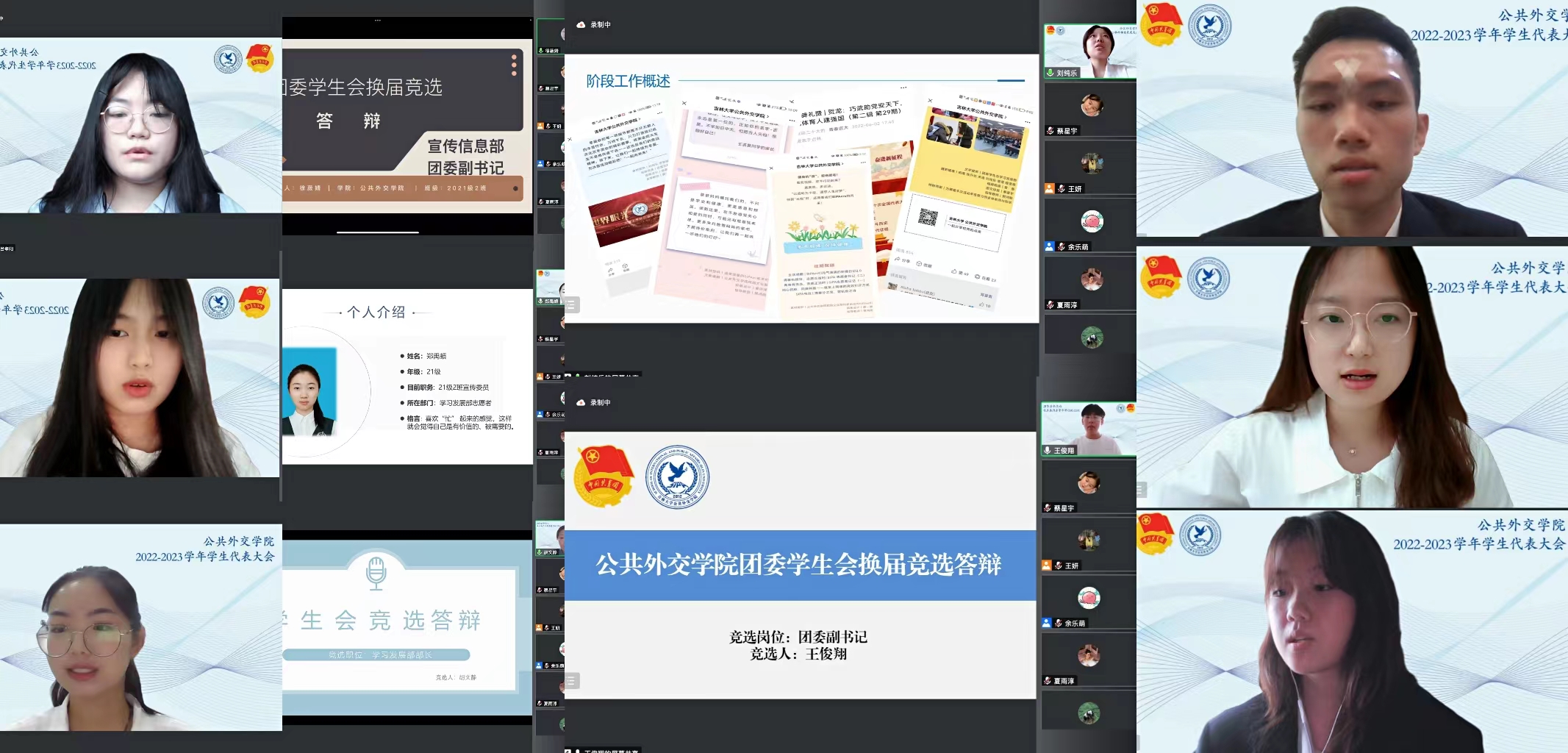 接下来,大会进行团委、学生会主要学生干部换届选举。11名候选人依次进行竞选答辩,他们分别从个人优势、学生工作经历、社会实践与志愿服务经历、岗位认知以及工作展望等方面做了全面而细致的汇报,展示了他们丰富的工作经验、服务学生的坚定信念与对学生工作的热爱。答辩结束后,全体与会代表开展了线上民主投票。