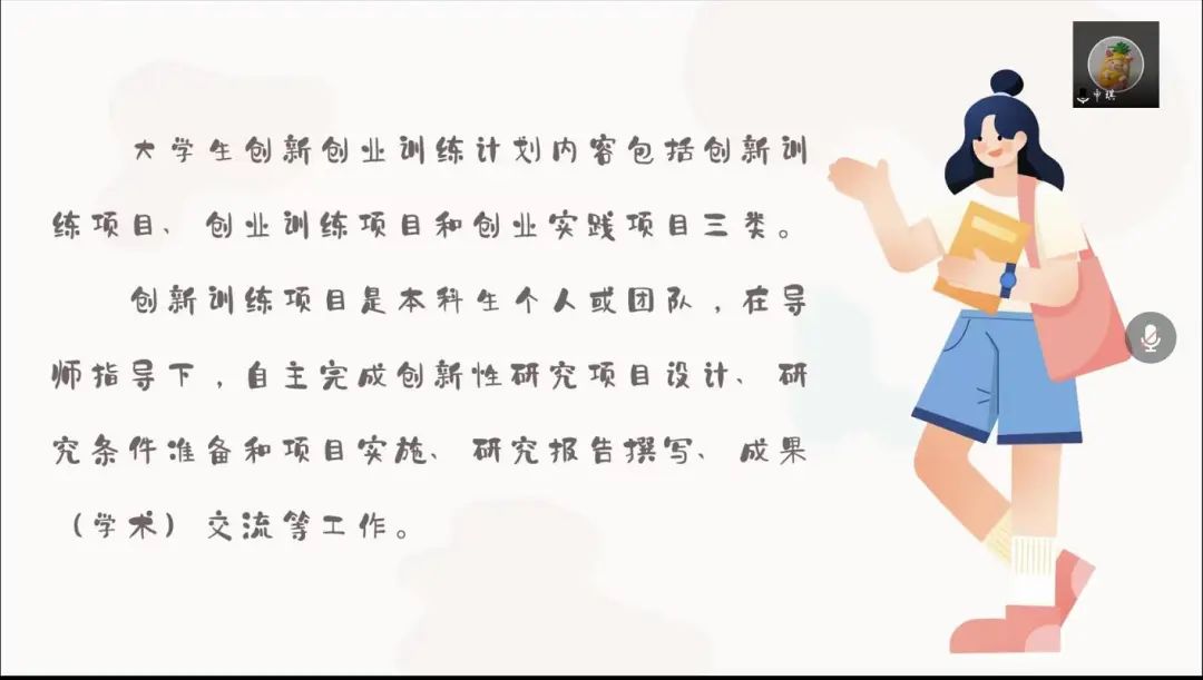 首先,19级的申琪同学通过简单介绍大学生创新创业训练计划的内容及流程,让大家对“大创”有了一个初步的了解。她从大创的前期准备出发,提出了关于申报、选题及组队方面的建议,接着又详细介绍了“大创”各环节,并结合自身经验,叮嘱同学们要加强团队间的沟通协作。回顾一年以来的参赛经历,申琪同学感触良多,她鼓励同学们结合个人能力、学院优势及时代背景,积极参与“大创”项目,锻炼自我。
