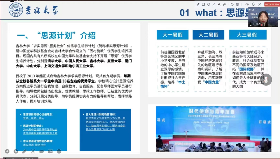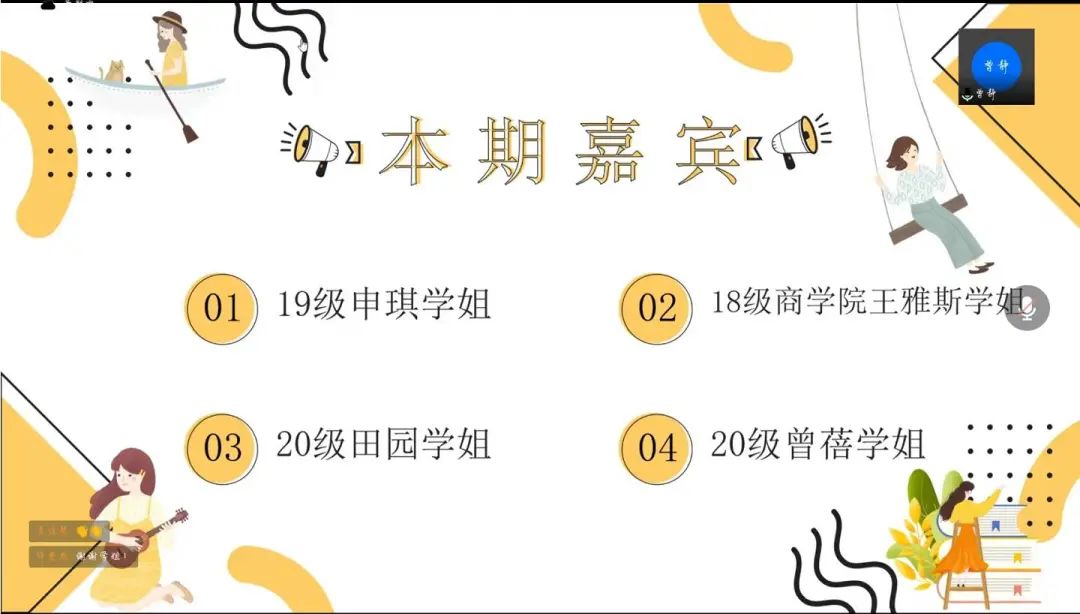 团委学生会学习发展部筹办了本学期第二期线上“青春分享课堂”活动。本次活动由21级本科生曾静主持,邀请到了19级本科生申琪、20级本科生曾蓓、田园和商学院18级本科生王雅斯四位同学为大家介绍关于青马工程、思源计划和大创等竞赛项目的有关内容。