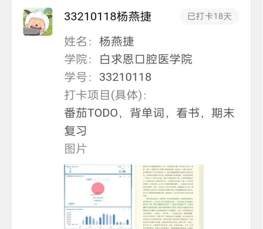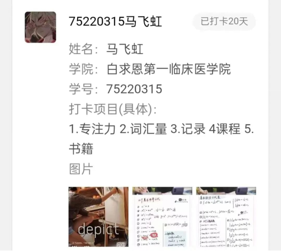 在这次打卡活动中我学到了很多。在这二十一天中,我参与了单词打卡,认识了许多新单词,加入了早起打卡 ,养成了每天早起的好习惯,更开发了不同的学习软件。这是一次难忘的学习活动,在群里,来自不同专业的同学们一起在坚持中体味努力学习与认真的乐趣。“知命不惧,日日自新”,这次活动让我感受到大学生活的意义,非常喜欢这次活动!