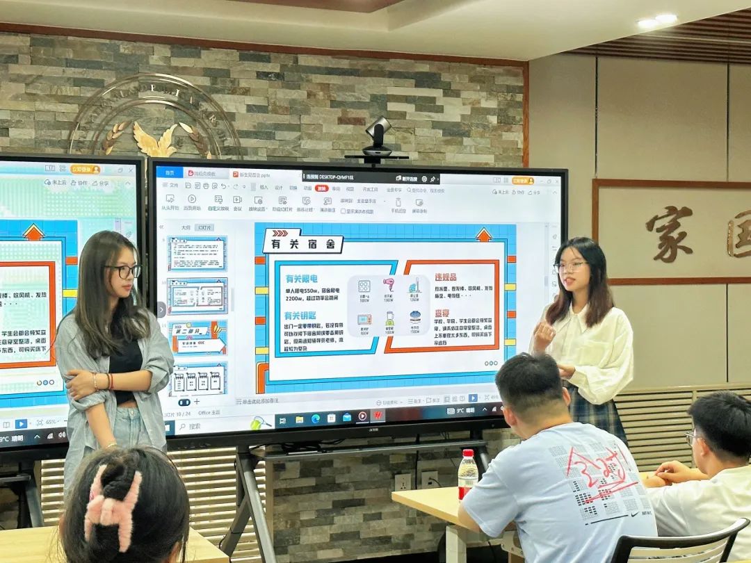 接着,郑含婷、秦越两位辅导员助理针对同学们初入大学的各种疑问进行了详细解答,并从学习、生活、军训等方面出发进行经验分享,帮助同学们更好更快地适应大学生活。